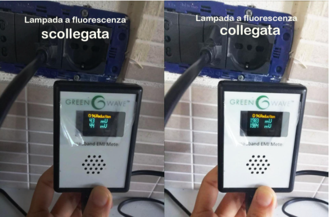 Nella seguente immagine possiamo vedere come, semplicemente collegando una lampada a fluorescenza alla rete elettrica, il valore di elettricità sporca misurata espresso in milliVolts aumenti di ben oltre quaranta volte.